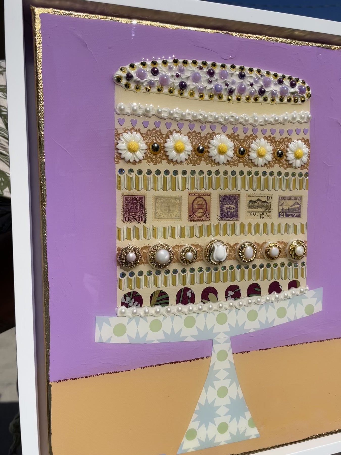 -Mixed media acrylic with vintage buttons, vintage stamps, wallpaper collage, rhinestones, faux pearls, lace, acrylic beads, gold leaf edges and resin on canvas