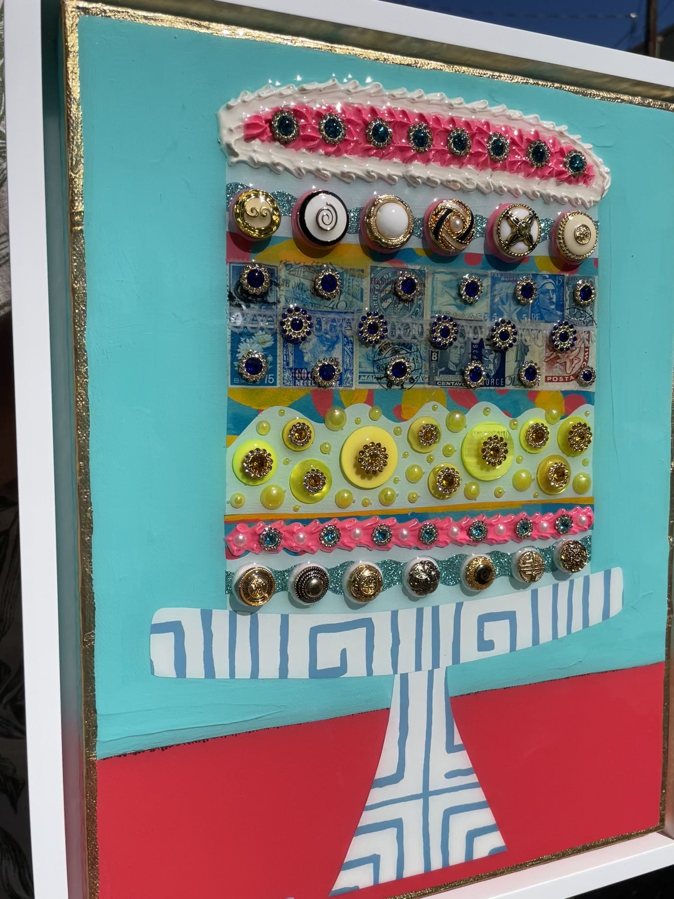-Mixed media acrylic with vintage buttons, vintage stamps, wallpaper collage, rhinestones, glass beads, faux pearls, gold leaf edges and resin on canvas